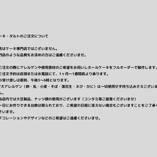 ・ご注文の際にアレルゲンや使用食材のご希望をお伺いしホールケーキをフルオーダーで製作します。